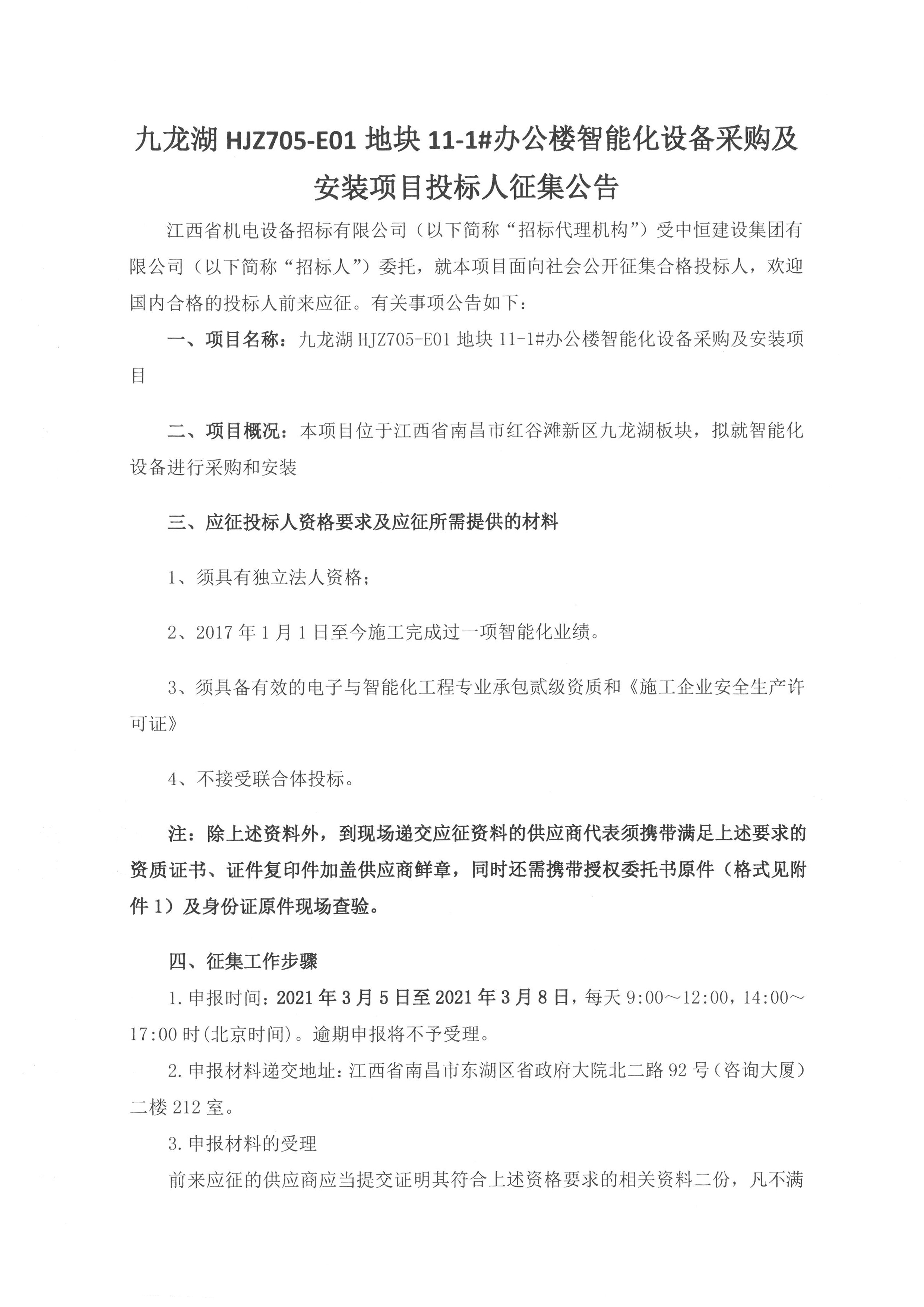 九龙湖HJZ705-E01地块11-1#办公楼智能化设备采购及安装项目投标人征集公告